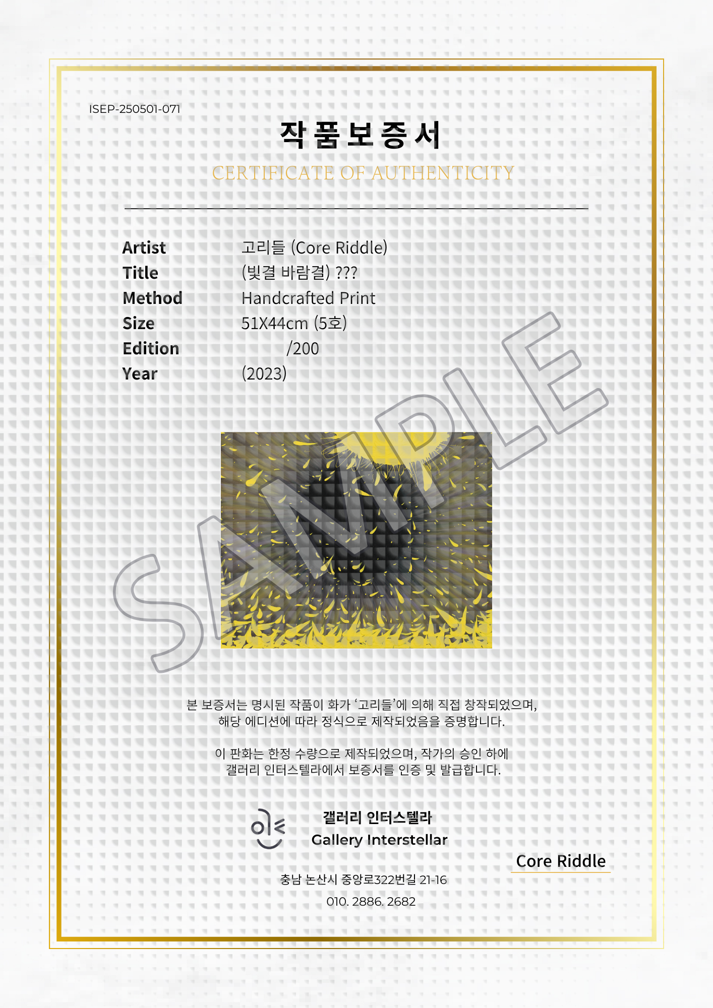 고리들 화가의 모든 에디션 판화 작품은 작가 본인의 서명 및 작품 정보를 담은 공식 보증서와 함께 전달됩니다. ‘작품 보증서(Certificate of Authenticity, COA)’는 소장하신 작품이 정식으로 제작된 한정판이며, 화가가 직접 인증한 진본임을 증명하는 문서입니다.