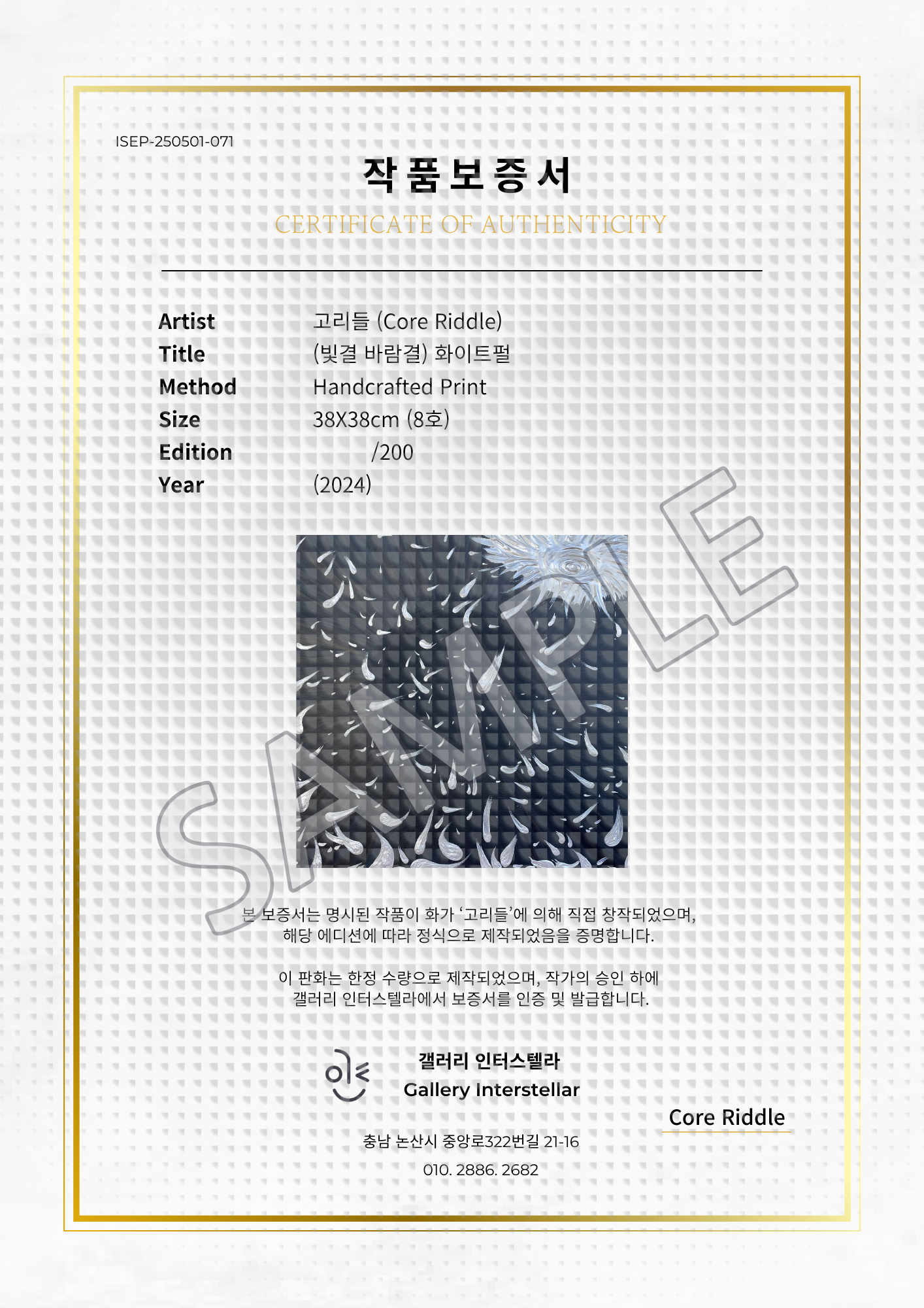 고리들 화가의 모든 에디션 판화 작품은 작가 본인의 서명 및 작품 정보를 담은 공식 보증서와 함께 전달됩니다. ‘작품 보증서(Certificate of Authenticity, COA)’는 소장하신 작품이 정식으로 제작된 한정판이며, 화가가 직접 인증한 진본임을 증명하는 문서입니다.
