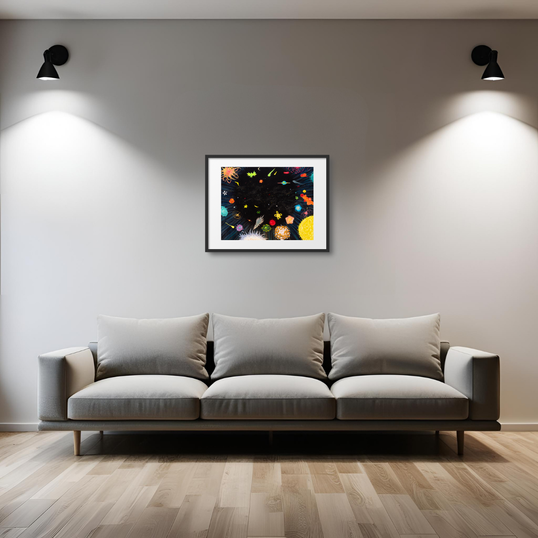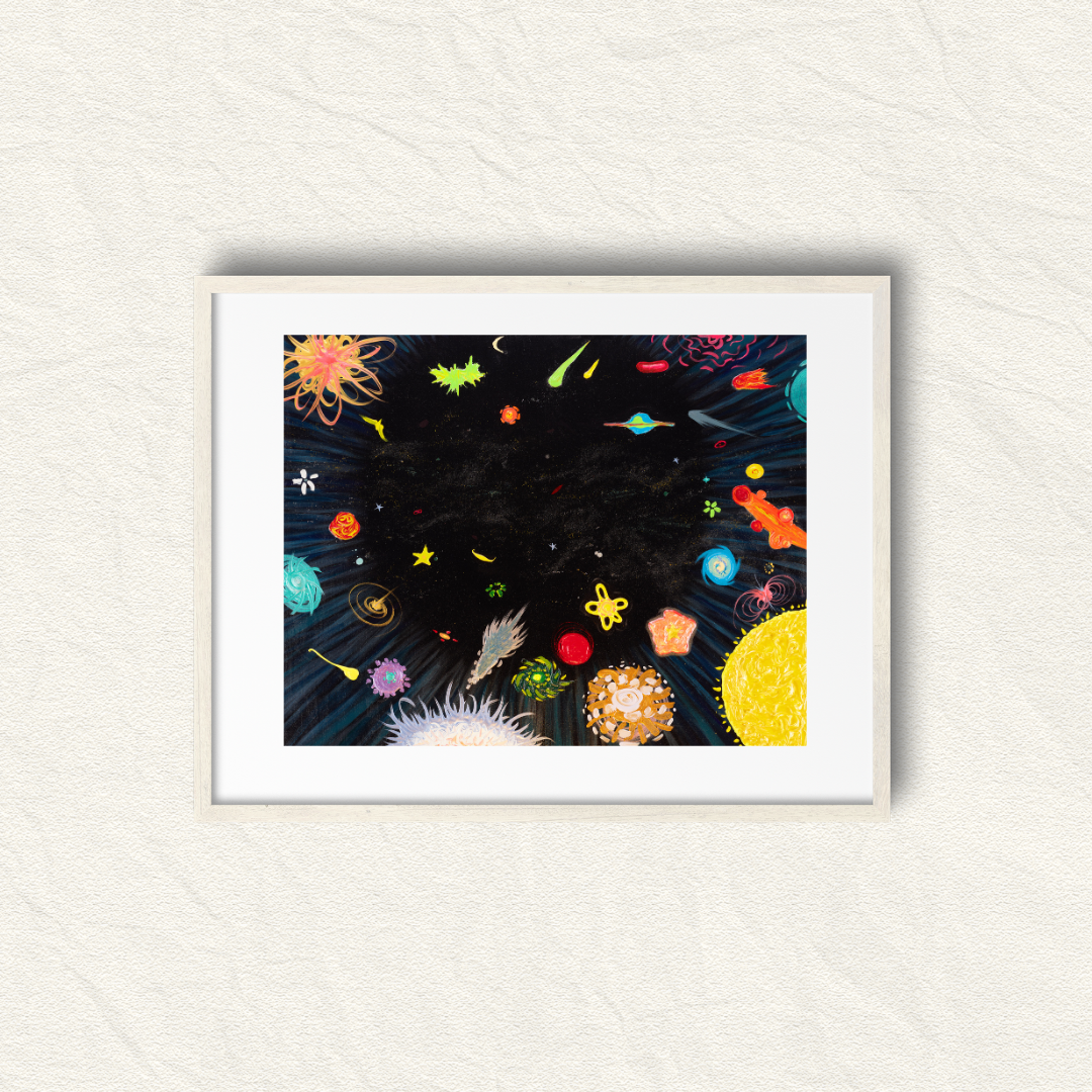 ‘별꽃은하’는 마치 실제로 존재할 것만 같은 우주 세계로 우리를 끌어들이는 동시에, 순수했던 동심으로 만들어가는 동화 속 우주를 보여줍니다. 화가는 관객이 작품 속 별꽃과 은하들로 구성된 메타버스에서 뛰어 노는 어린 아이가 되길 바랍니다. 우주는 존재하는 그대로도 경이롭지만, 동심으로 바라볼 때 진짜 살아 움직이는 것처럼 많은 가능성이 존재합니다.《별꽃은하》는 단순한 동화 속 우주가 아닌, 당신 안의 기억, 상상, 놀이, 희망이 함께 피어나는 감각의 우주입니다.