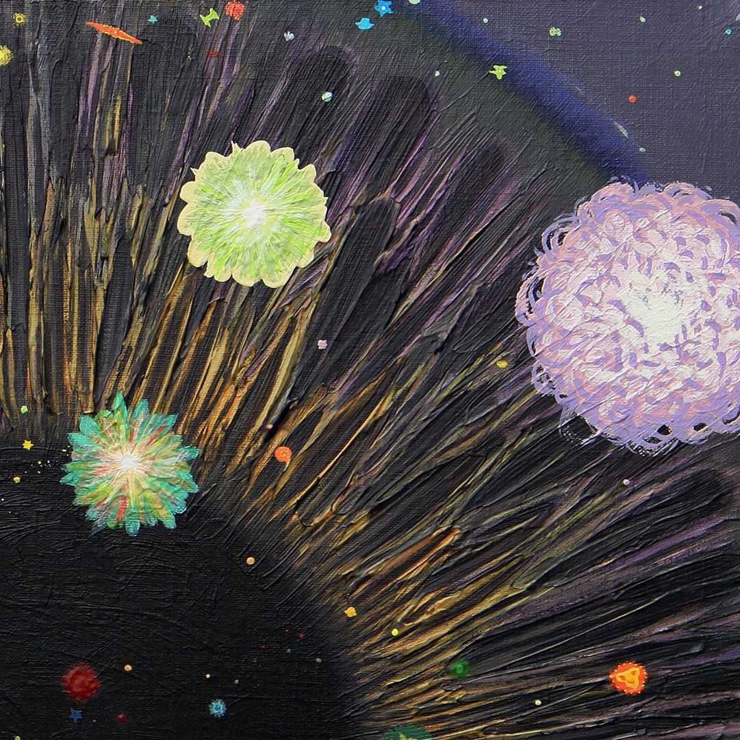 《별꽃우주》는 고리들 화가의 세계관을 대표하는 ‘관찰자와 우주’ 시리즈의 상징작입니다. 별들을 꽃으로 표현한 첫 번째 작품으로, 양자역학의 철학적 기반인 ‘관찰자 효과’에서 영감을 받았습니다.