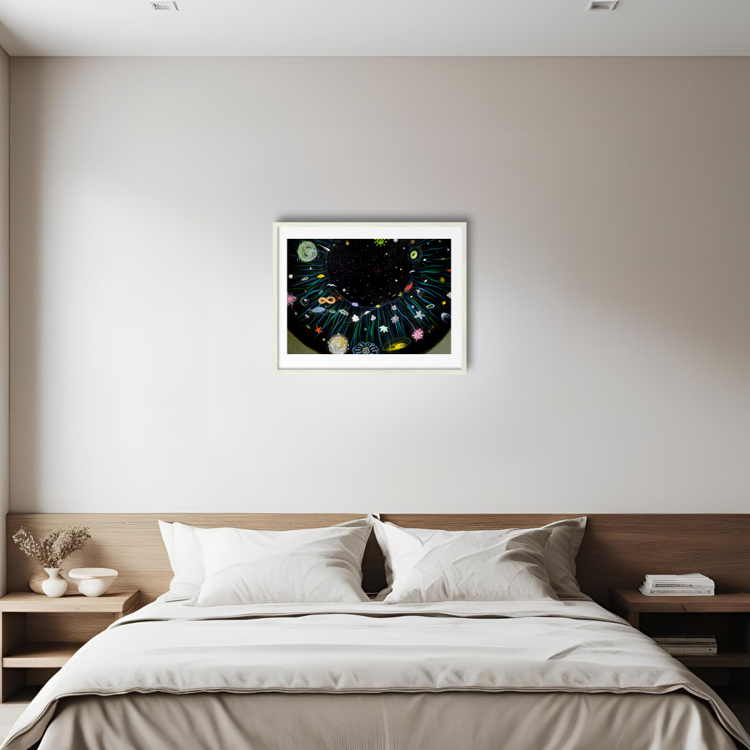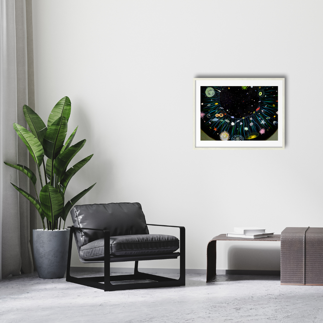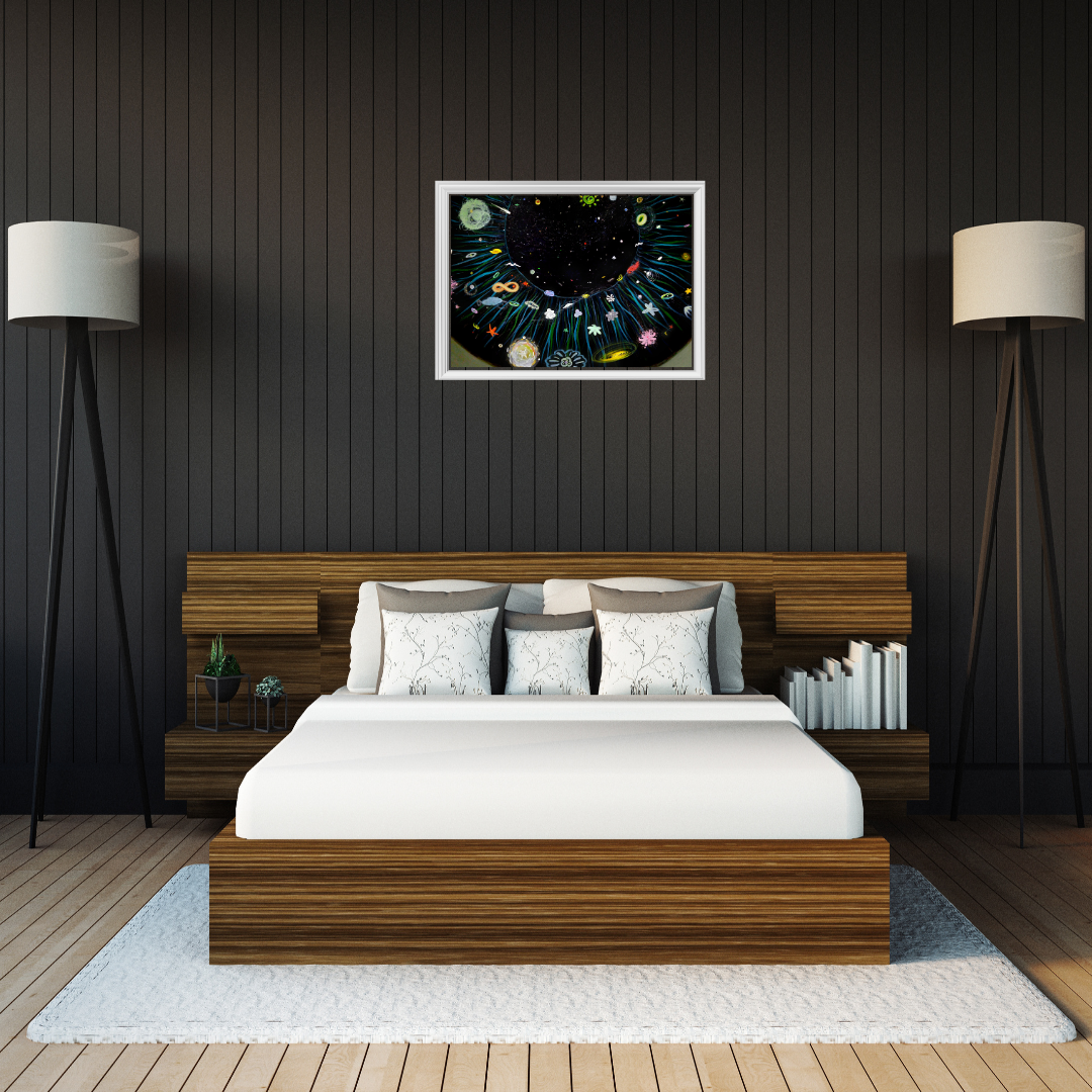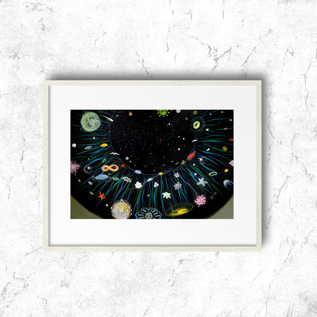 작품의 구조는 거대한 눈동자, 중심부는 동공-우주의 심연-블랙홀을 상징합니다. 홍채는 오선지처럼 부채꼴로 펼쳐져 있으며, 별들과 은하들은 음악처럼 흩어진 음표로 배치되어 ‘우주 교향곡’의 시각적 이미지로 완성됩니다. 흩어진 별들은 단순한 점이 아니라, 의식을 가진 존재, 또는 기억의 입자로 해석할 수 있습니다.