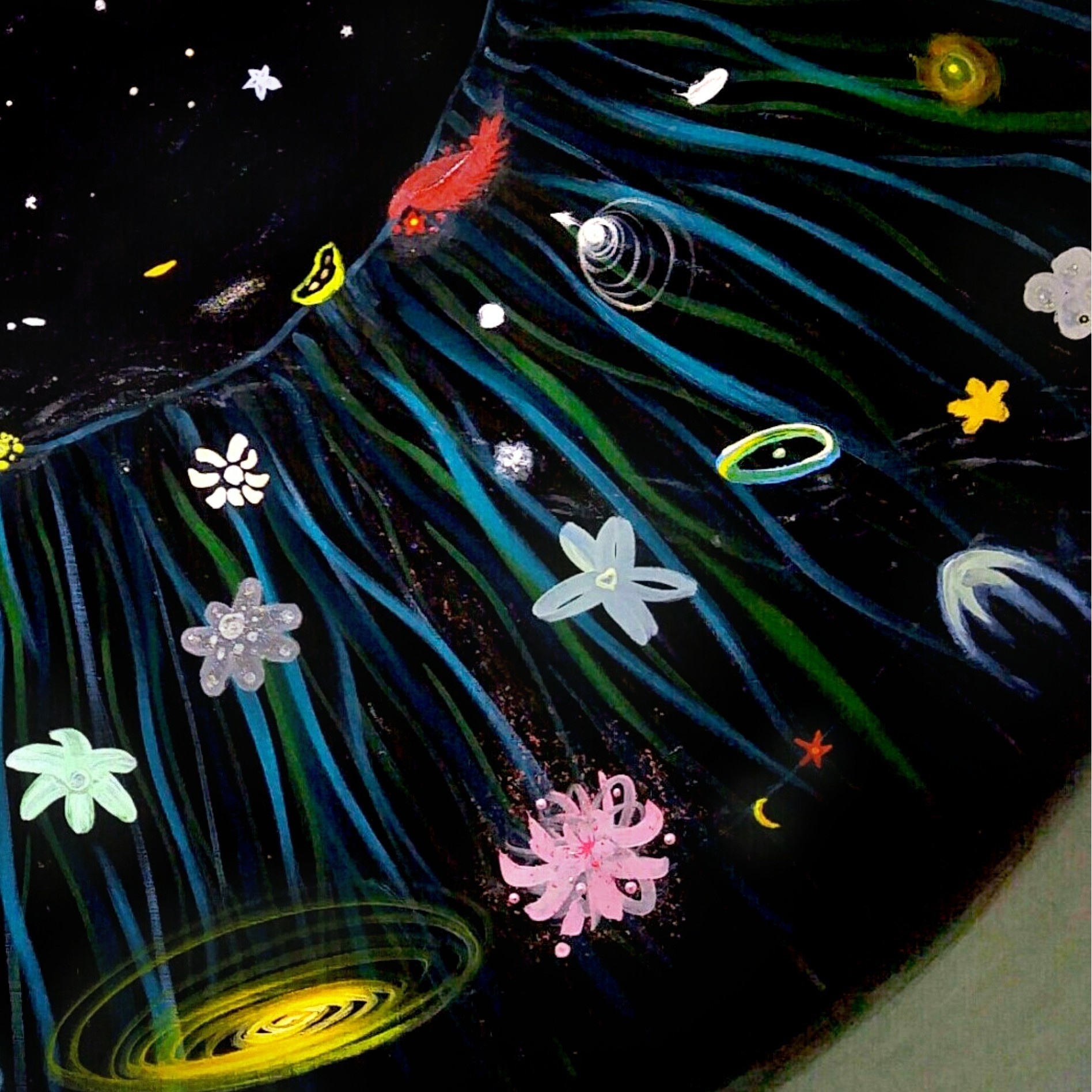 〈별꽃바다〉는 눈동자 시리즈 중, 다양한 생명체들로 가득찬 상상력을 담은 작품입니다. 별과 은하들이 바닷속 해양 생물처럼 유영하며, 홍채 위에 펼쳐진 우주-바다의 교향곡을 만들고 있습니다. 작품은 ‘관찰자’가 눈을 뜨는 순간, 그의 홍채 위에서 수많은 별과 은하가 자각하고 존재하게 되는 창조의 첫 장면을 표현합니다.