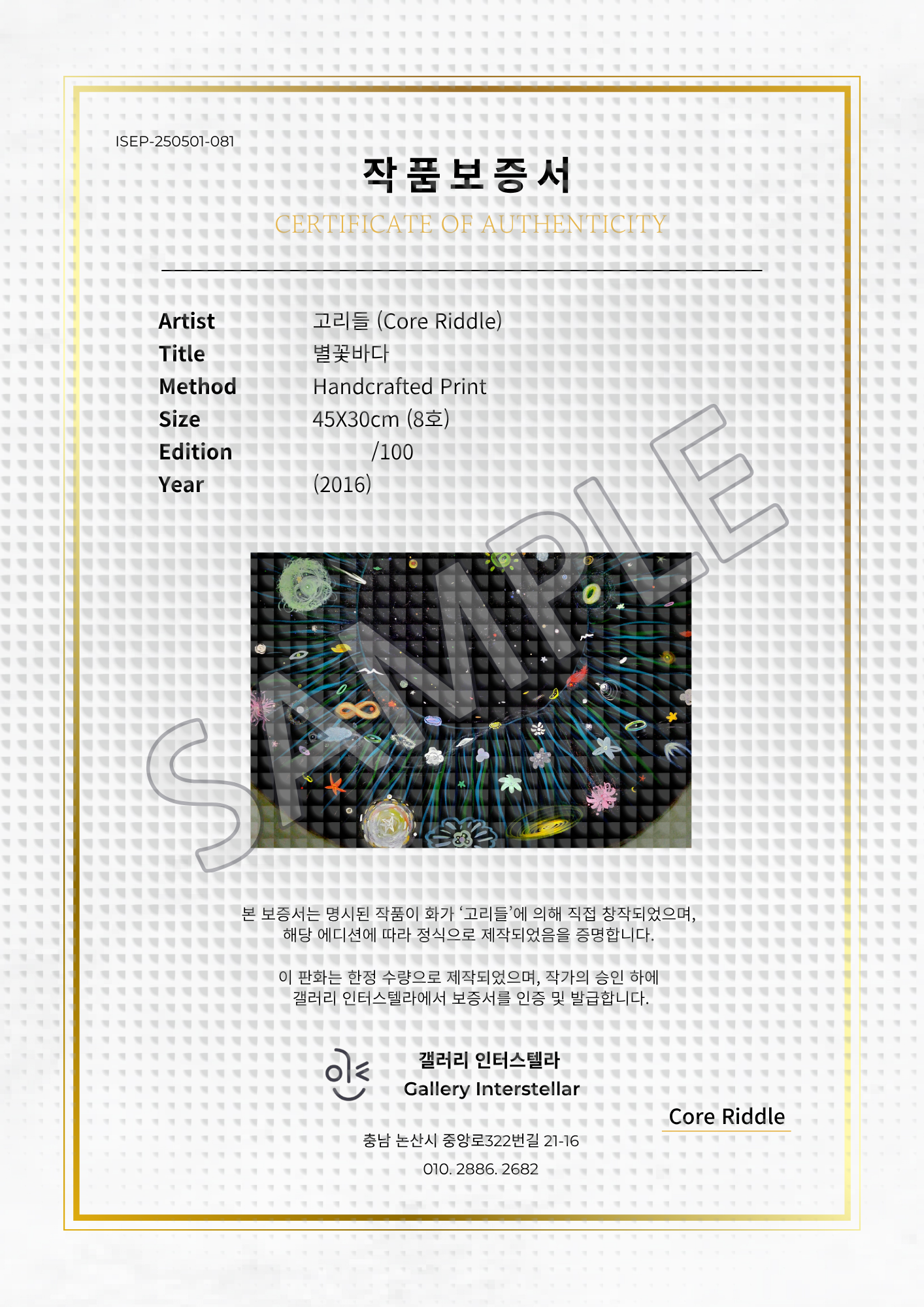 고리들 화가의 모든 에디션 판화 작품은 작가 본인의 서명 및 작품 정보를 담은 공식 보증서와 함께 전달됩니다. ‘작품 보증서(Certificate of Authenticity, COA)’는 소장하신 작품이 정식으로 제작된 한정판이며, 작가가 직접 인증한 진본임을 증명하는 문서입니다.