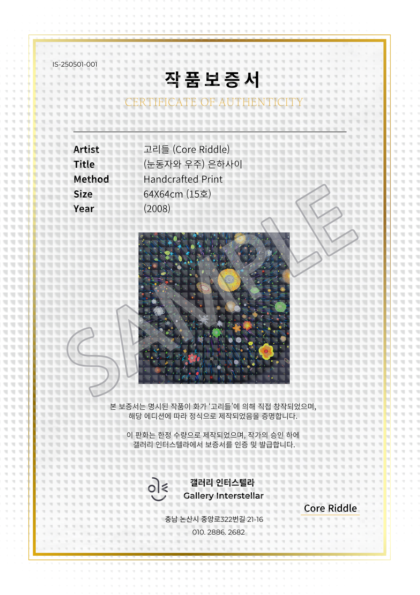 고리들 화가의 모든 에디션 판화 작품은 작가 본인의 서명 및 작품 정보를 담은 공식 보증서와 함께 전달됩니다. ‘작품 보증서(Certificate of Authenticity, COA)’는 소장하신 작품이 정식으로 제작된 한정판이며, 작가가 직접 인증한 진본임을 증명하는 문서입니다.