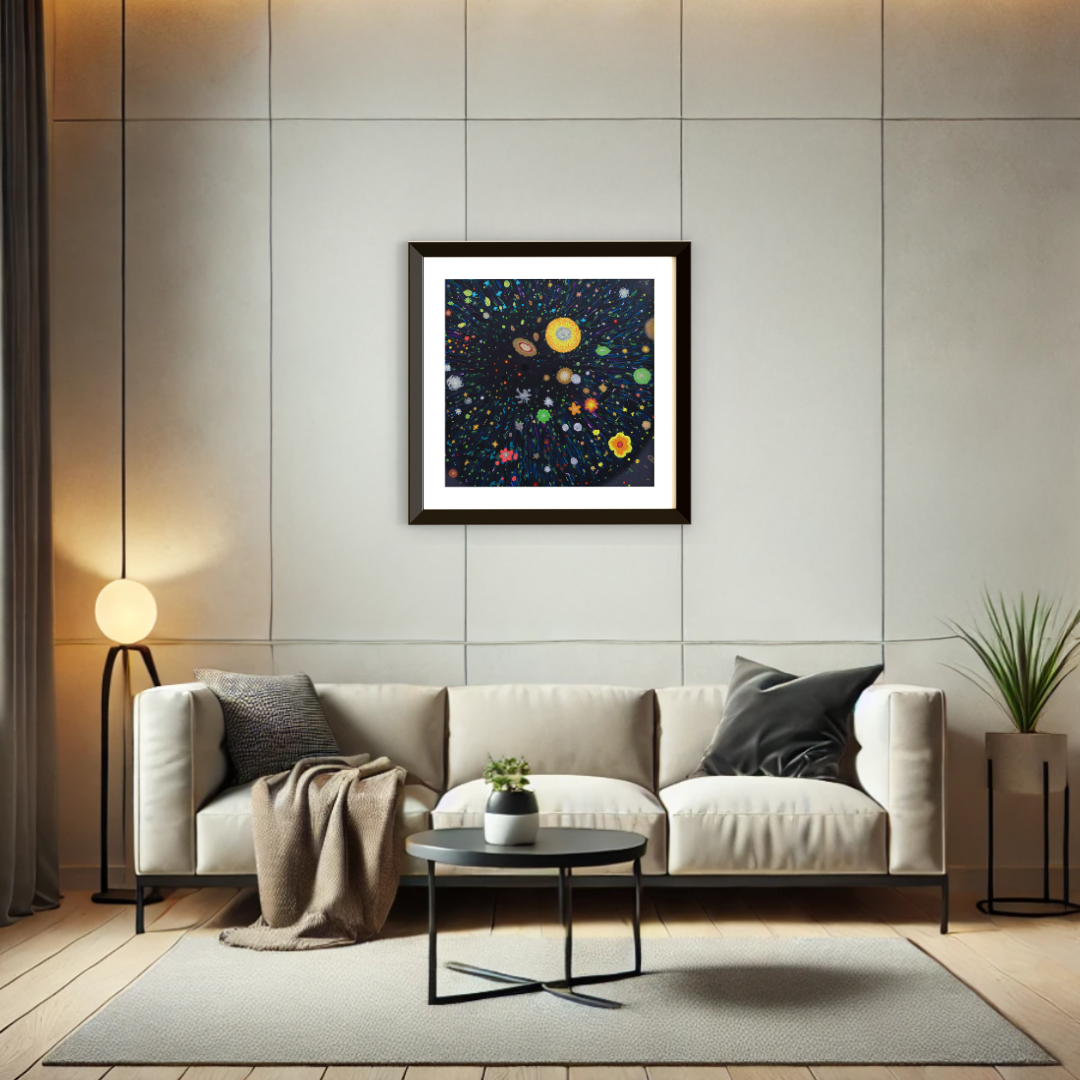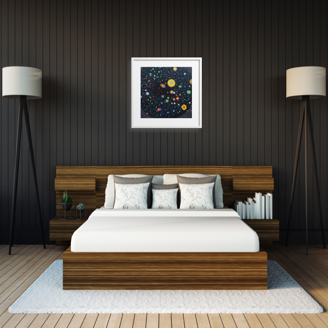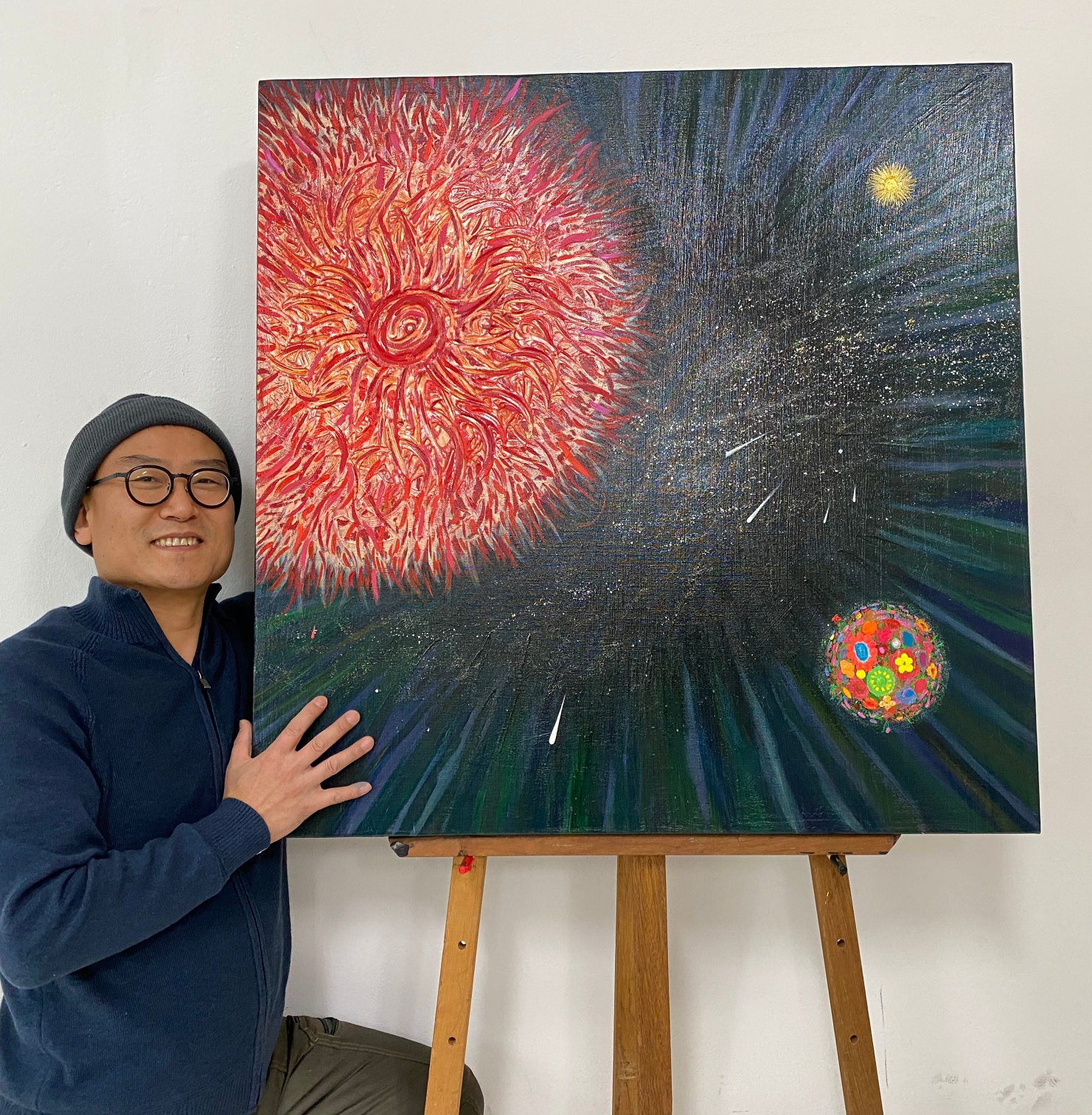 허블 망원경이 포착한 사진을 잡지에서 본 후, 그리기 시작한 것이 은하사이의 시초입니다. 빅뱅 '대폭발'로 우주에 무수한 원자가 뿌려져, 은하가 되고 별이 되어가는 과정을 작품에 담았으며, 중앙의 큰 동공은 블랙홀을 형상화한 신의 눈동자입니다.