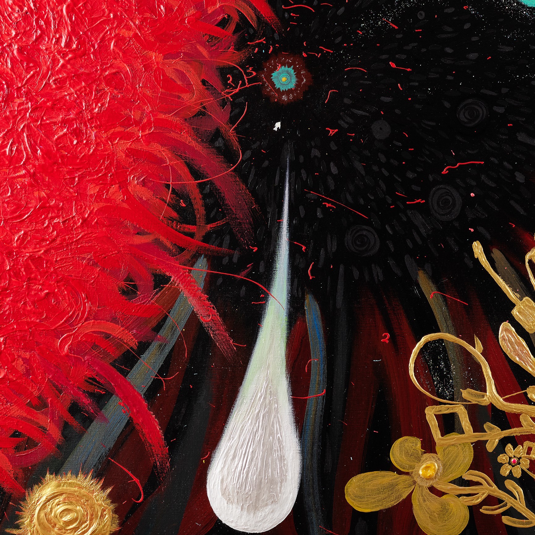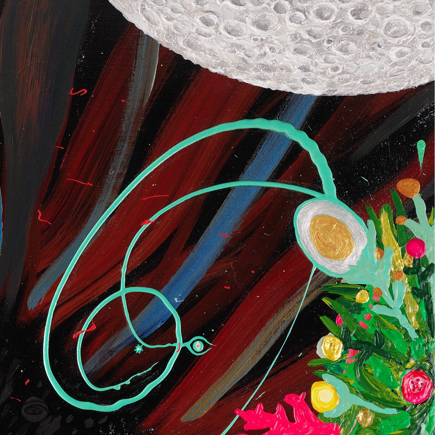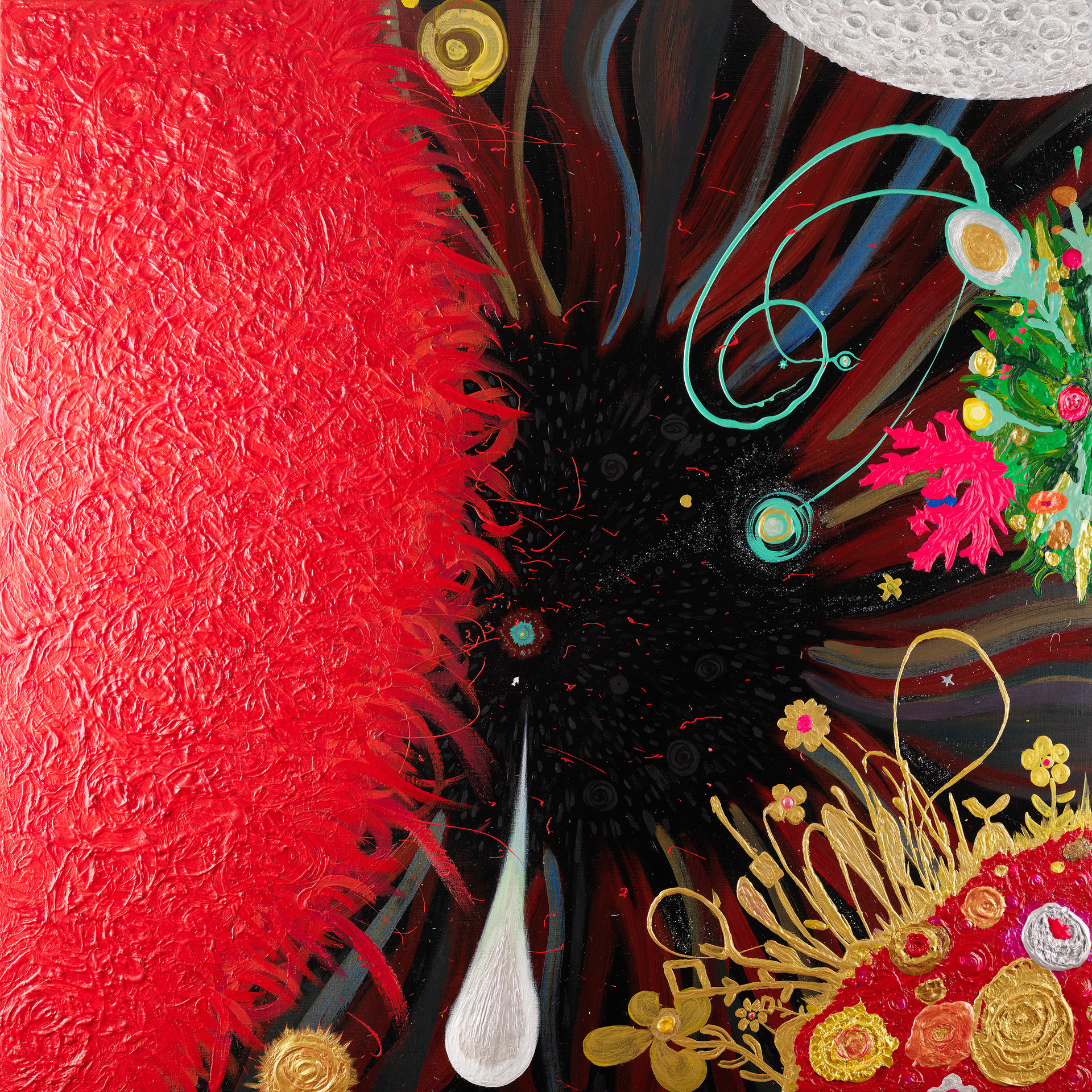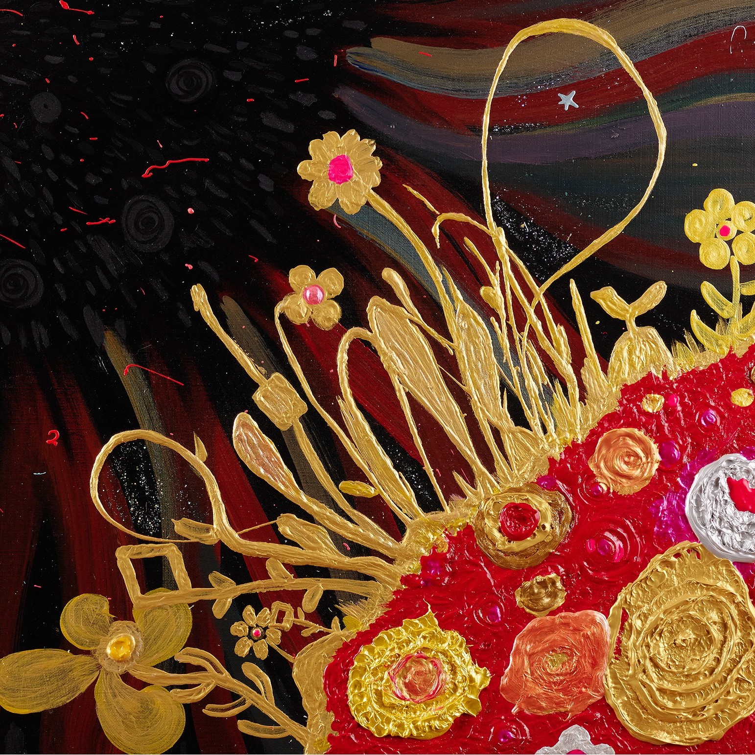 작품은 자신의 환경에 적응하기 위해 새로운 형태로 구성된 상상의 식물들을 담고 있습니다. 그 꽃과 식물들은 생명과 영혼의 원천인 은하와 유기적으로 소통하며, 늘 연결되어 있는 모습을 형상화합니다. 화가는 작품 세계에서, 별은 꽃이 되고, 영혼이 별이 되는 무한한 연결고리를 형성하며, 그 안에서 생명체들은 정보와 에너지를 다차원 평행우주를 매개로 무한대로 펼쳐가는 과정을 담고 있습니다.